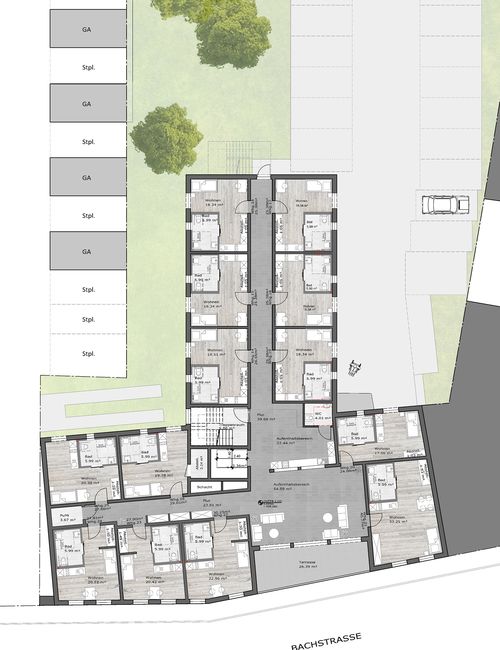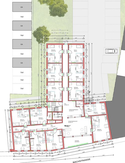 Das Architektenbüro Michael Mies GmbH übernimmt sowohl die vollständige Bauplanung als auch die Bauleitung. Das barrierefrei konzipierte Gebäude zeichnet sich durch eine hochenergieeffiziente Bauweise aus und verfügt über zahlreiche Stellplätze sowie Garagen.